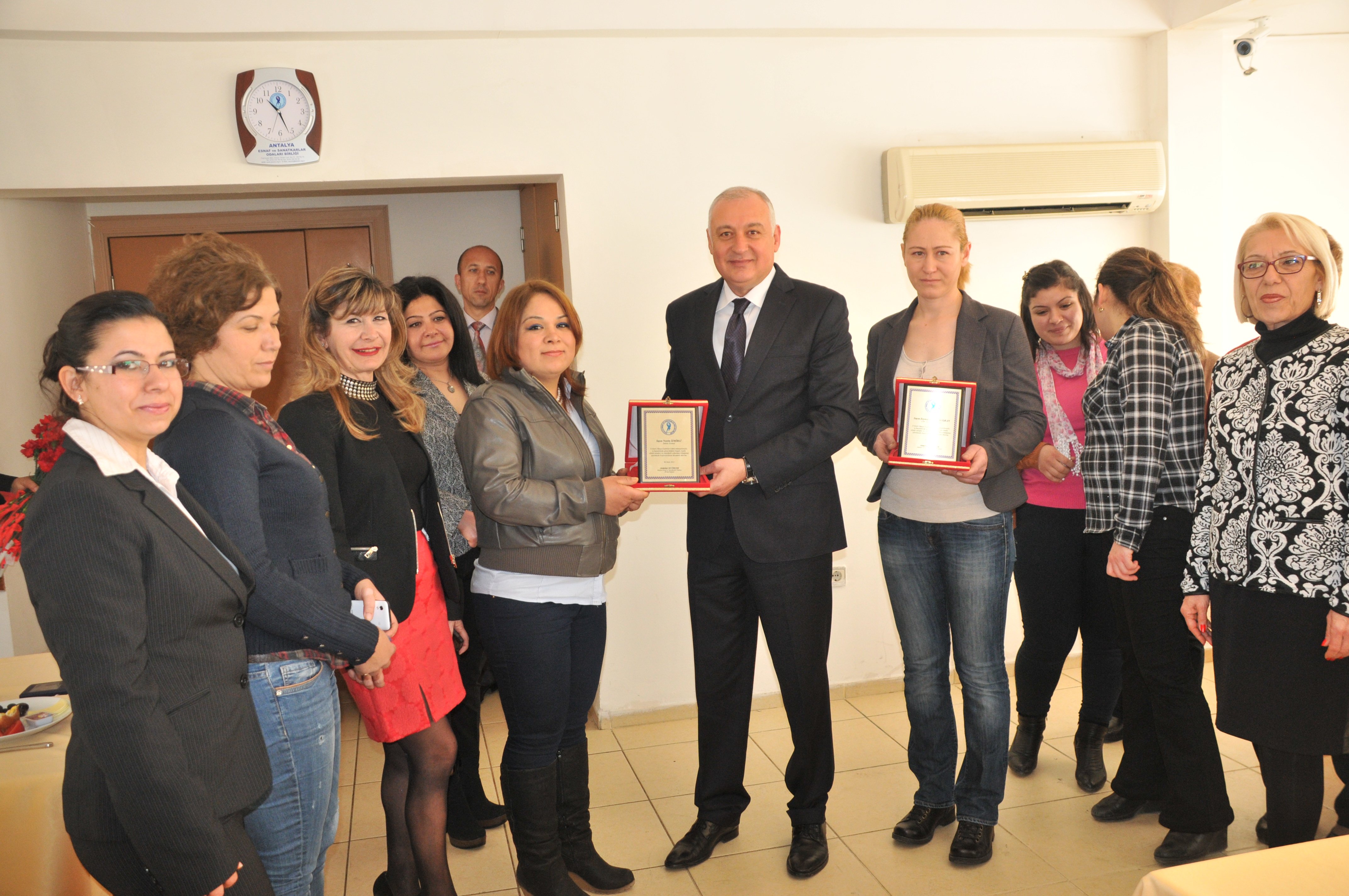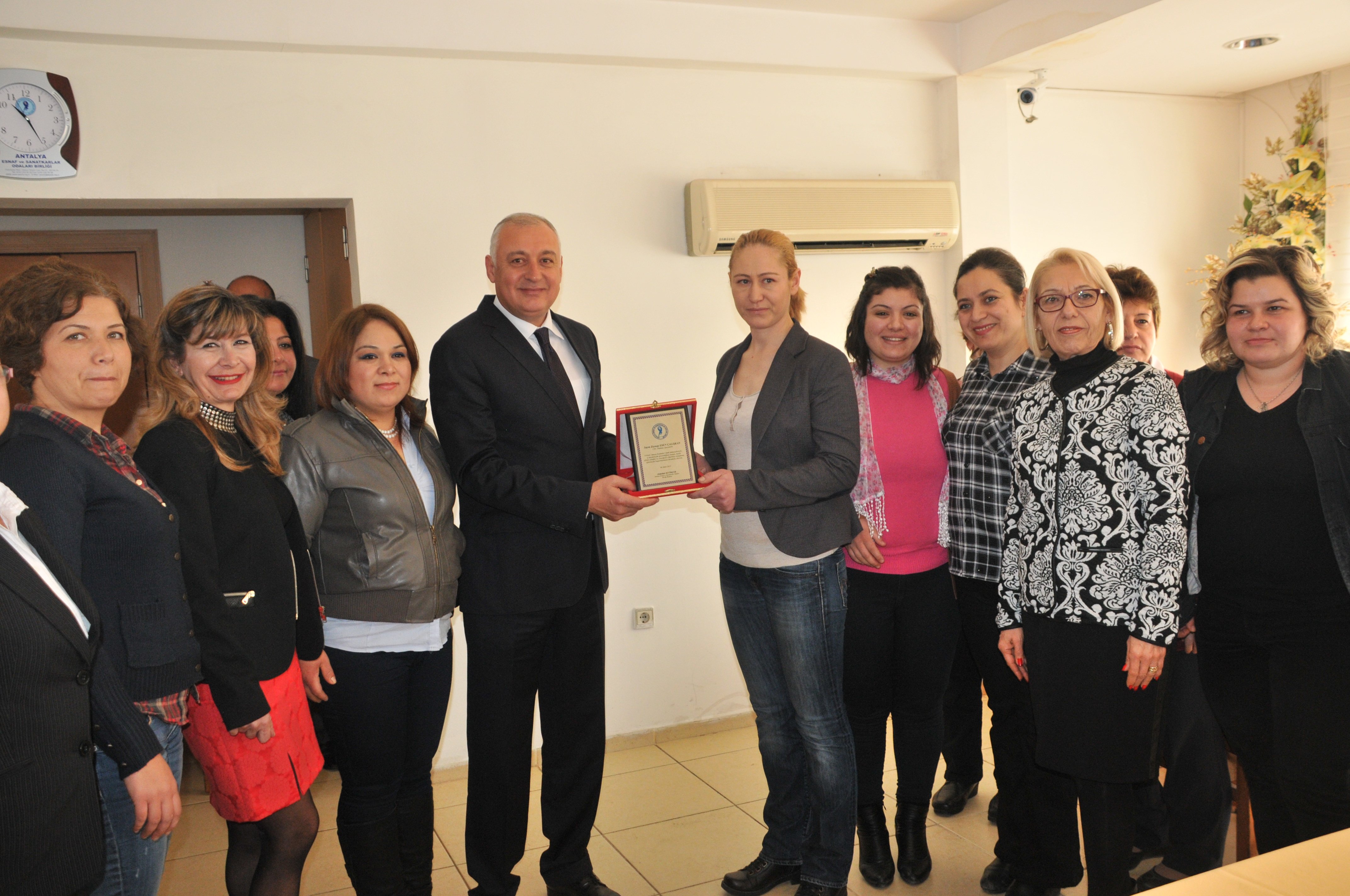 Antalya Esnaf ve Sanatkarlar Odaları Birliği Kadınlar Kurulu 8 Mart Dünya Emekçi Kadınlar Günü adına odamız üyesi raf ticareti yapan sayın Nesri İZMİRLİ'ye ve üyemiz çalışanı tornacılık mesleğini icra eden Zeynep ESEN ÇALIŞKAN'a plaket verdi. Plaketlerin Antalya Esnaf ve Sanatkarlar Odaları Birliği Başkanı Sayın Abdullah SEVİMÇOK tarafından teslim edilirken, Kadın Kurulu Başkanı Sayın Zühal AKSU "Kadın her yerde başarılıdır, yeter ki istesin" dedi.